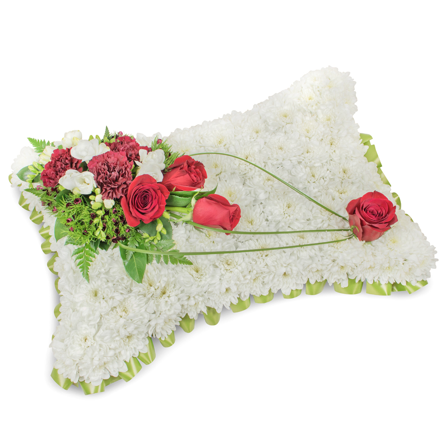 Show your heartfelt compassion with our elegantly designed flower bouquet. This arrangement combines the purity of white chrysanthemums with the passion of red roses and deep dark red carnations, enhanced by the softness of white freesias, tender dianthus, and natural bear grass.